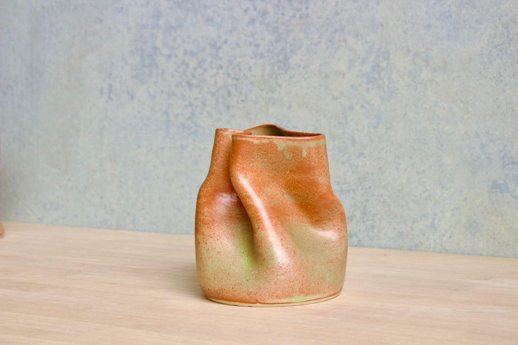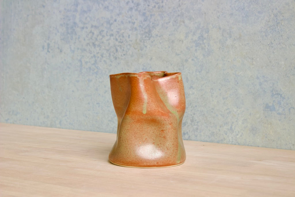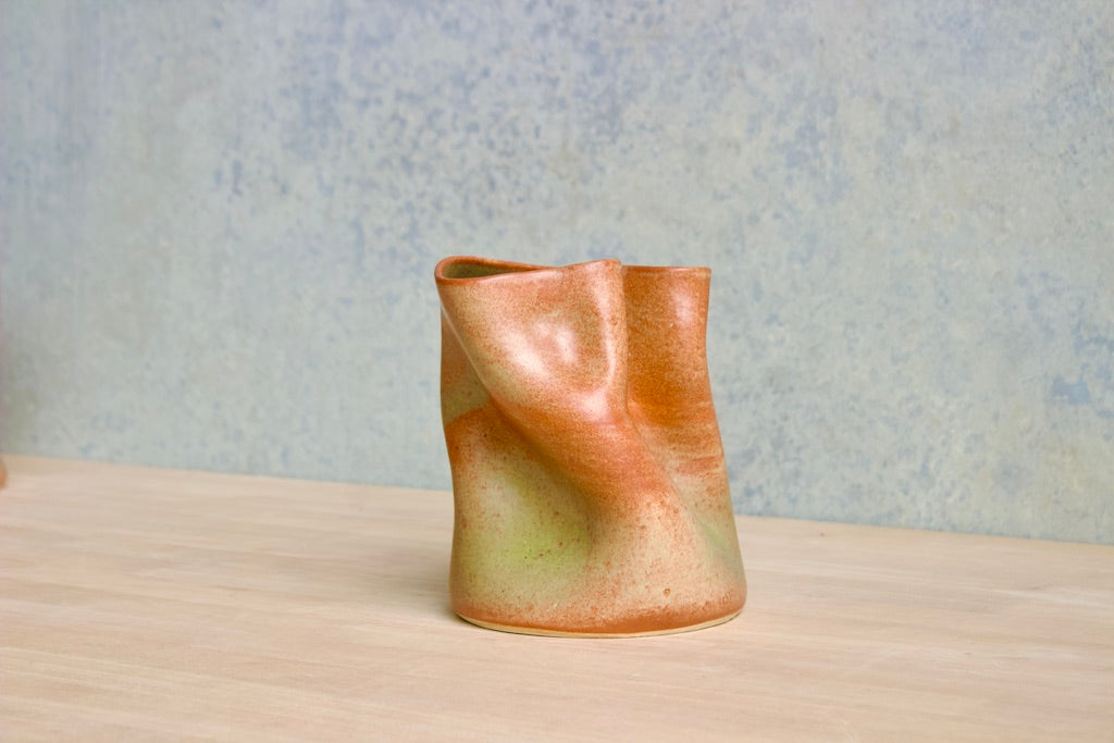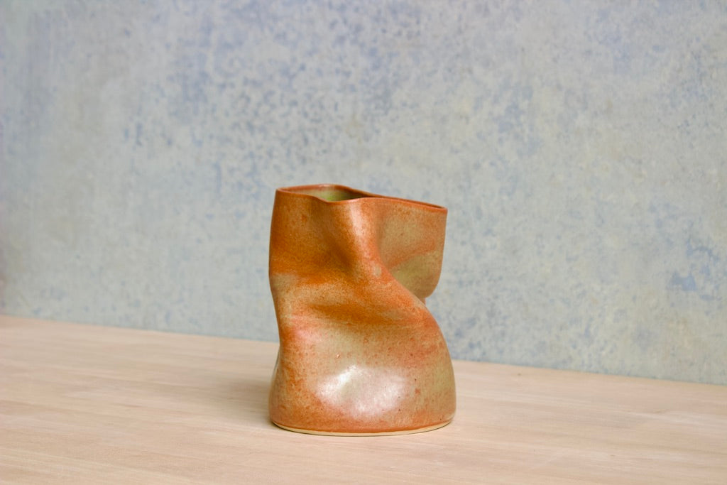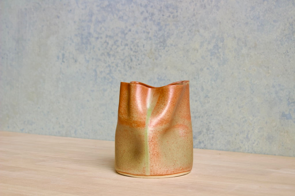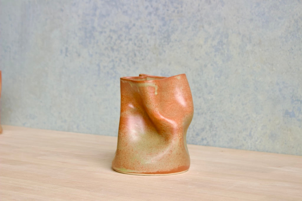 Wheel thrown and hand crumpled, each vase is a unique testament to the artist's touch, its form shaped by the caress of hands. No two are alike, each bearing a distinct story told through its creases and folds.