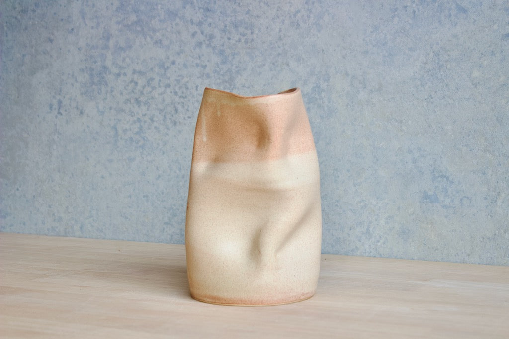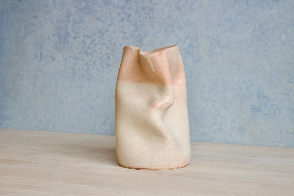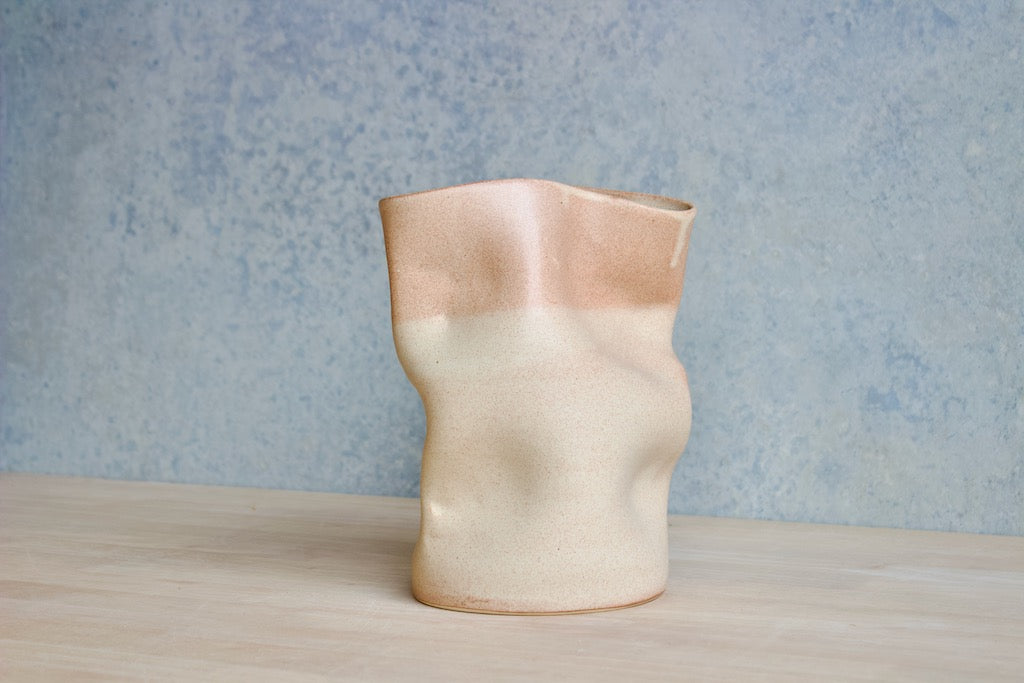 Wheel thrown and hand crumpled, each vase is a unique testament to the artist's touch, its form shaped by the caress of hands. No two are alike, each bearing a distinct story told through its creases and folds.
